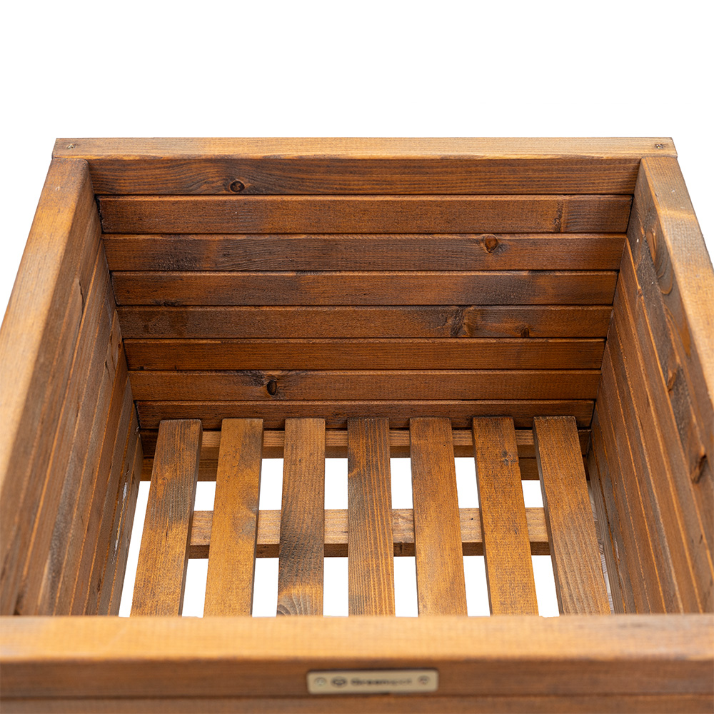 Der Boden des Topfes ist so gestaltet, dass die Luft frei zirkulieren kann und überschüssiges Wasser gut abfließen kann. Ein hochwertiges 100g-Agrotextilgewebe verhindert den direkten Kontakt zwischen Erde und Holz und hilft, das Substrat feucht zu halten. Dies gewährleistet, dass die Pflanzenwurzeln optimale Wachstumsbedingungen vorfinden.