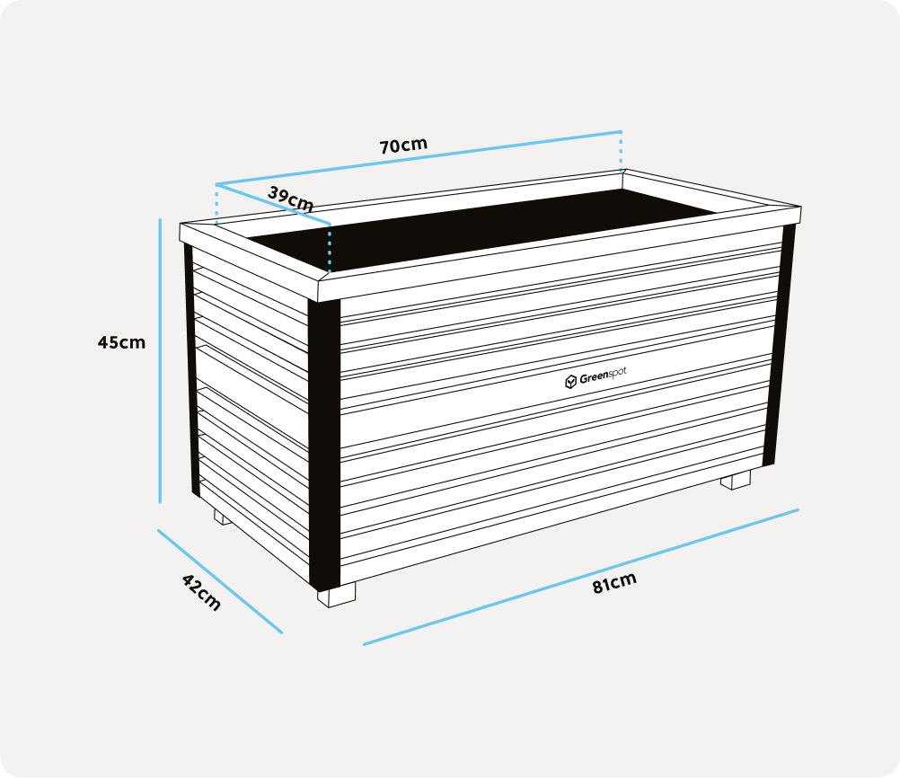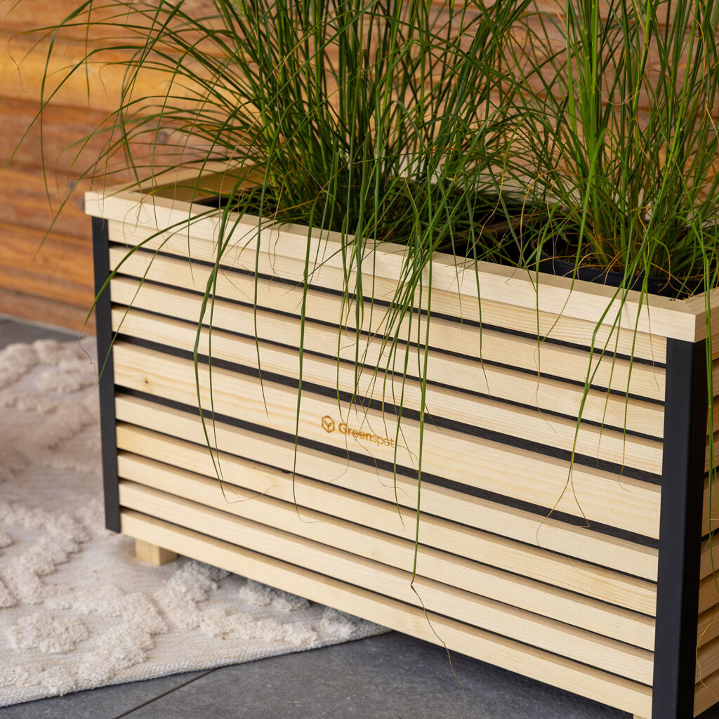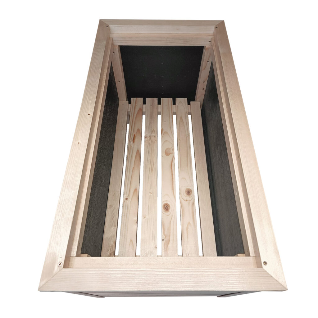 Der Topf wurde mit viel Liebe zum Detail hergestellt und verbindet die Schönheit des natürlichen Holzes mit einer robusten Konstruktion. Die Fichtenholzlatten wurden sorgfältig auf dickem, wasserfestem Sperrholz befestigt und das Ganze wurde mit einer Harzimprägnierung geschützt. Das macht den Topf wetterfest und er muss bis zu 7 Jahre lang nicht gestrichen werden!
